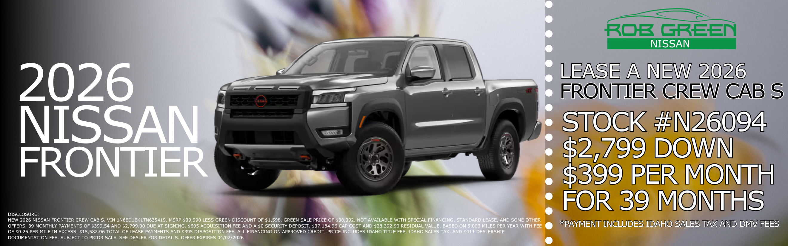 DISCLOSURE: NEW 2026 NISSAN FRONTIER CREW CAB S. VIN 1N6ED1EK1TN635419. MSRP $39,990 LESS GREEN DISCOUNT OF $1,598. GREEN SALE PRICE OF $38,392. NOT AVAILABLE WITH SPECIAL FINANCING, STANDARD LEASE, AND SOME OTHER OFFERS. 39 MONTHLY PAYMENTS OF $399.54 AND $2,799.00 DUE AT SIGNING. $695 ACQUISITION FEE AND A $0 SECURITY DEPOSIT. $37,184.96 CAP COST AND $28,392.90 RESIDUAL VALUE. BASED ON 5,000 MILES PER YEAR WITH FEE OF $0.25 PER MILE IN EXCESS. $15,582.06 TOTAL OF LEASE PAYMENTS AND $395 DISPOSITION FEE. ALL FINANCING ON APPROVED CREDIT. PRICE INCLUDES IDAHO TITLE FEE, IDAHO SALES TAX, AND $411 DEALERSHIP DOCUMENTATION FEE. SUBJECT TO PRIOR SALE. SEE DEALER FOR DETAILS. OFFER EXPIRES 04/02/2026