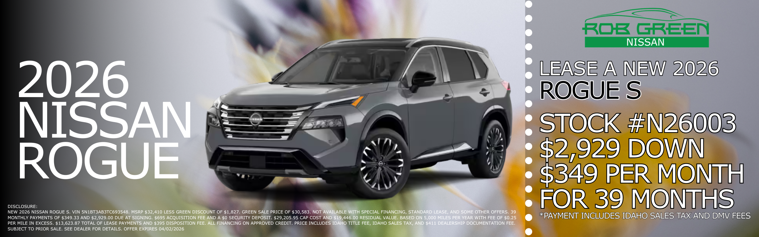 DISCLOSURE: NEW 2026 NISSAN ROGUE S. VIN 5N1BT3AB3TC693548. MSRP $32,410 LESS GREEN DISCOUNT OF $1,827. GREEN SALE PRICE OF $30,583. NOT AVAILABLE WITH SPECIAL FINANCING, STANDARD LEASE, AND SOME OTHER OFFERS. 39 MONTHLY PAYMENTS OF $349.33 AND $2,929.00 DUE AT SIGNING. $695 ACQUISITION FEE AND A $0 SECURITY DEPOSIT. $29,205.95 CAP COST AND $19,446.00 RESIDUAL VALUE. BASED ON 5,000 MILES PER YEAR WITH FEE OF $0.25 PER MILE IN EXCESS. $13,623.87 TOTAL OF LEASE PAYMENTS AND $395 DISPOSITION FEE. ALL FINANCING ON APPROVED CREDIT. PRICE INCLUDES IDAHO TITLE FEE, IDAHO SALES TAX, AND $411 DEALERSHIP DOCUMENTATION FEE. SUBJECT TO PRIOR SALE. SEE DEALER FOR DETAILS. OFFER EXPIRES 04/02/2026