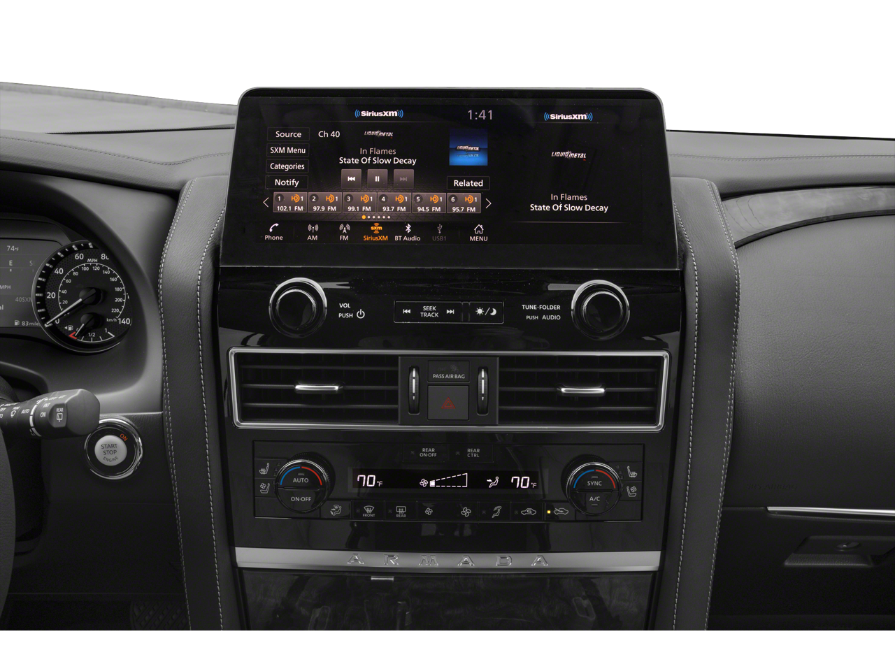 Step inside the Armada Platinum and be enveloped in a world of refined luxury. Quilted leather seating, heated and ventilated front seats, and a heated steering wheel provide unmatched comfort, while the 13-speaker premium audio system and NissanConnect infotainment system with navigation ensure you're always entertained and connected.